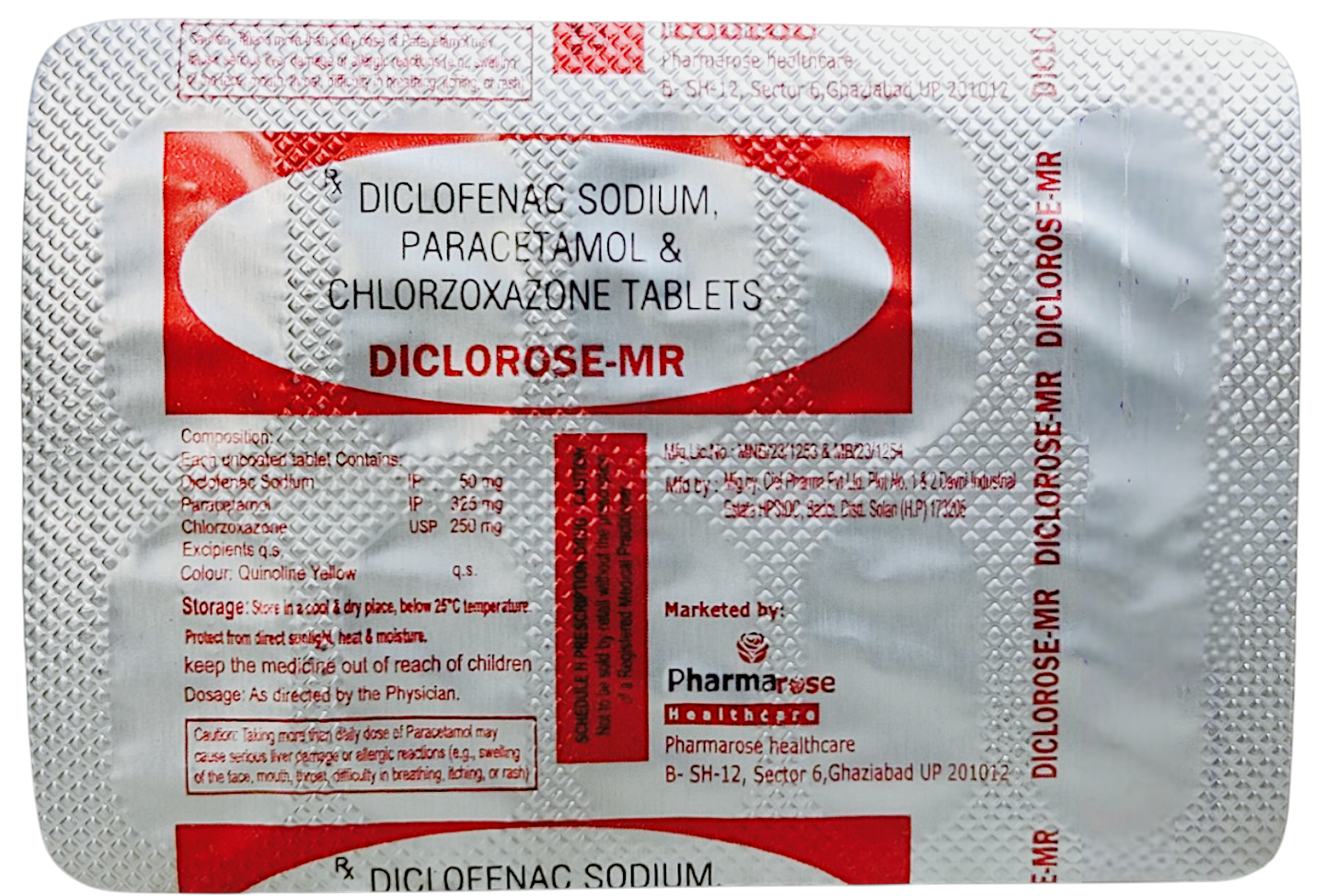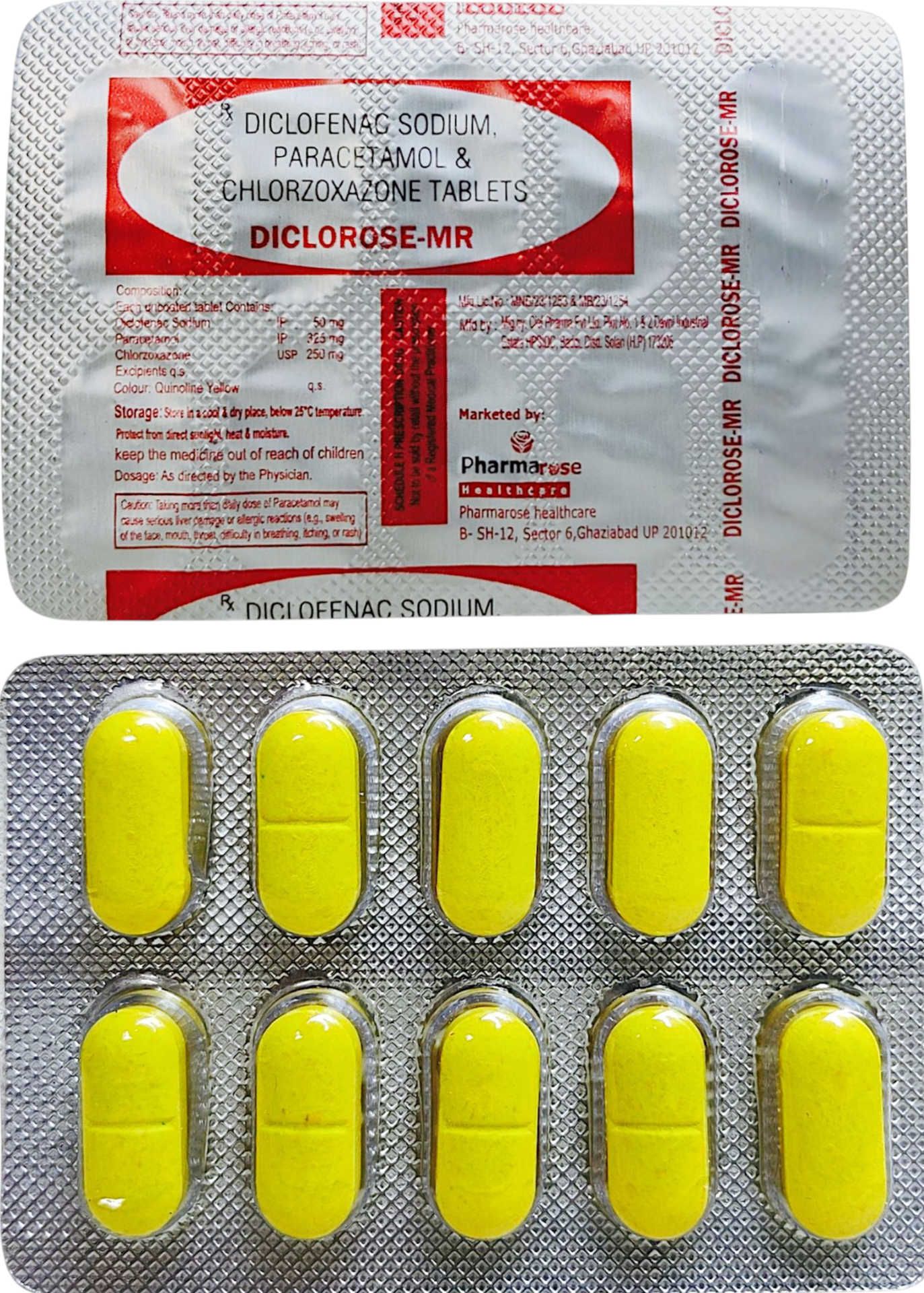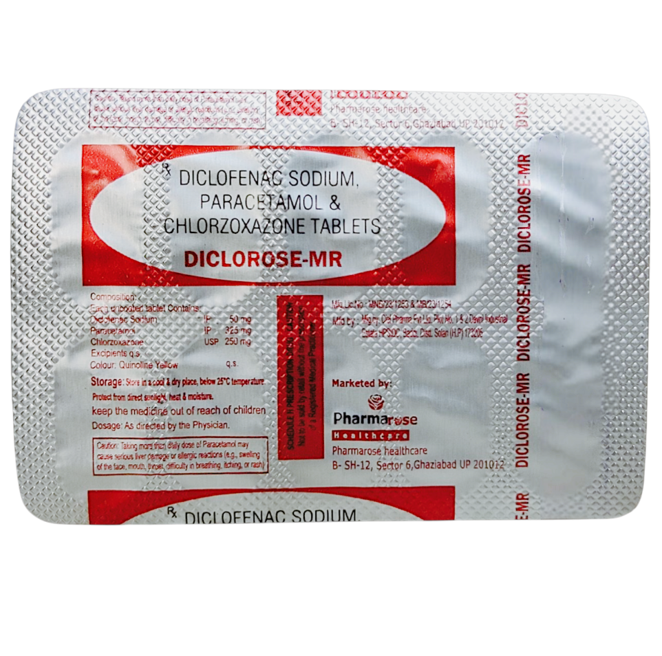 Diclorose MR Tablet is a combination medicine used in the treatment of pain due to muscle spasms. It improves the movement of muscles and provides relief from pain and discomfort associated with muscle spasms.